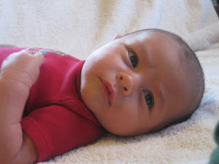 Getting ready for bath time:) Little mister had his 4 month doc. appt. yesterday and he weighed 12 pnds. 13 oz. I think he was 24 1/2 inches long. He was about 25 % on his weight. The doc said he was really healthy and a happy baby. I told him most of the time he is happy, don't let him fool you!
